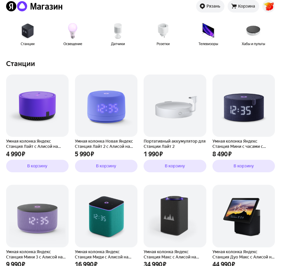 Магазин Алисы содержит все актуальные модели умных устройств.